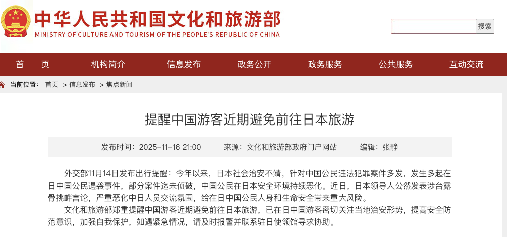 文旅部发布提醒近期避免前往日本旅游